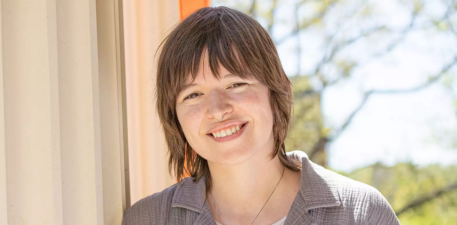 A person with short hair is smiling while leaning against a light-colored pillar. They are wearing a textured, button-up shirt. The background features a blurred outdoor setting with trees and a clear sky.